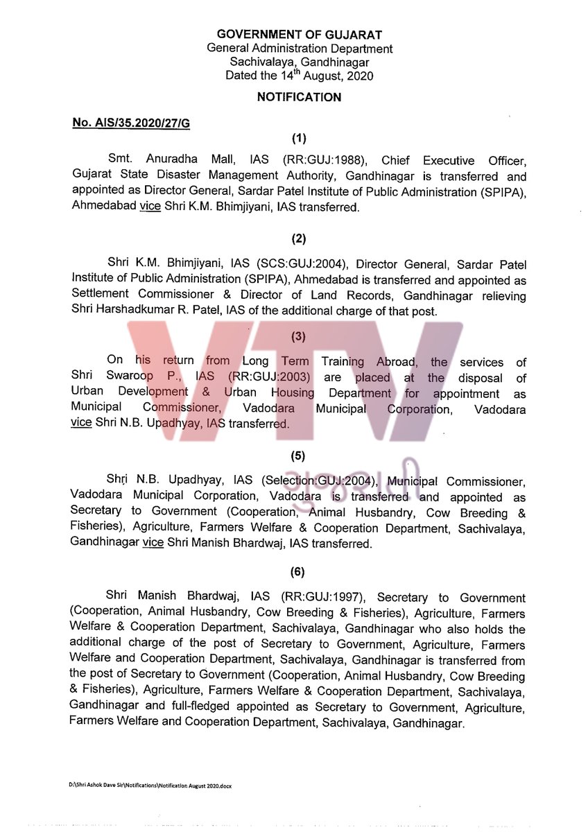 Vtv Gujarati News And Beyond On Twitter Guj Govt Orders Transfer Of 5 Ias Officer P Svarup As Vmc Commissioner N B Upadhyay As Agriculture Secretary Anuradha Mal As Spipa Director K M