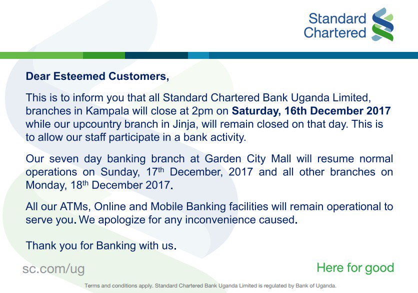 Standard Chartered Ug A Twitter Dear Esteemed Customers Kindly Be Informed That Our Branches Will Be Closed This Saturday 16th December 2017 All Our Atms Online And Mobile Banking Facilities Will Remain